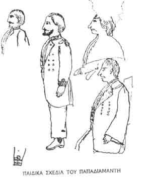 Ο ΠΑΠΑΔΙΑΜΑΝΤΗΣ ΚΑΙ Η ΖΩΓΡΑΦΙΚΗ Στις πρώτες σελίδες ενός τετραδίου έχει σχεδιάσει δύο καμαρωτούς αξιωματικούς σε στάση προσοχής. Ο ένας έχει σφηνωτό μούσι και φορά λαμπρή στρατιωτική στολή. Δίπλα βλέπουμε τη μορφή ενός ώριμου άνδρα σε δύο εκδοχές. Πιθανόν αυτός να είναι κάποιος δάσκαλός του.(εικόνα 1)